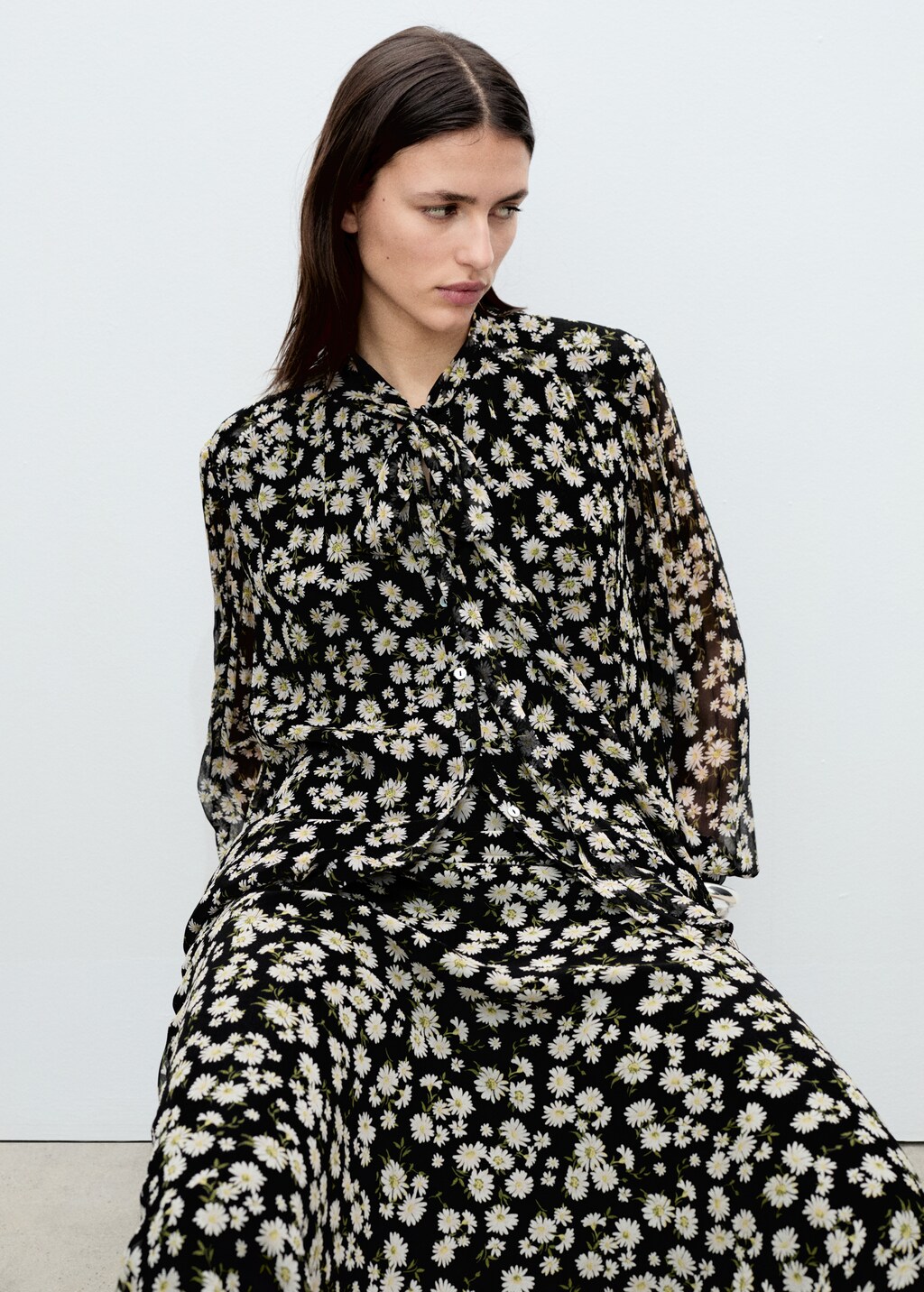 ткань из шифона, доступно plus, total look, прямой крой, полупрозрачный дизайн, цветочный принт, v-образный вырез, деталь с бантом на шее, длинные рукава, застежка на пуговицы спереди, внутренняя подкладка,, . внешняя длина: 40,7 cm . длина спины: 69,7 cm