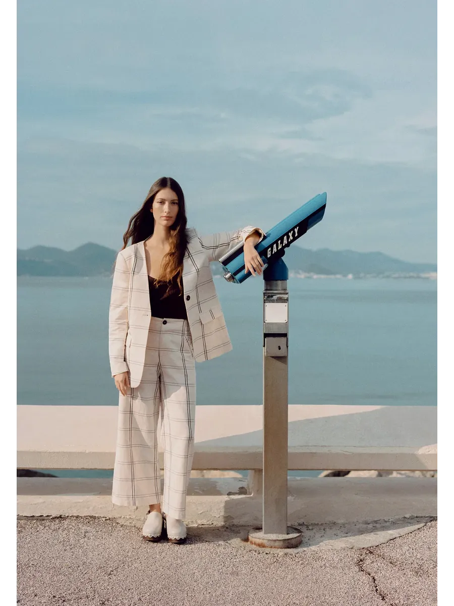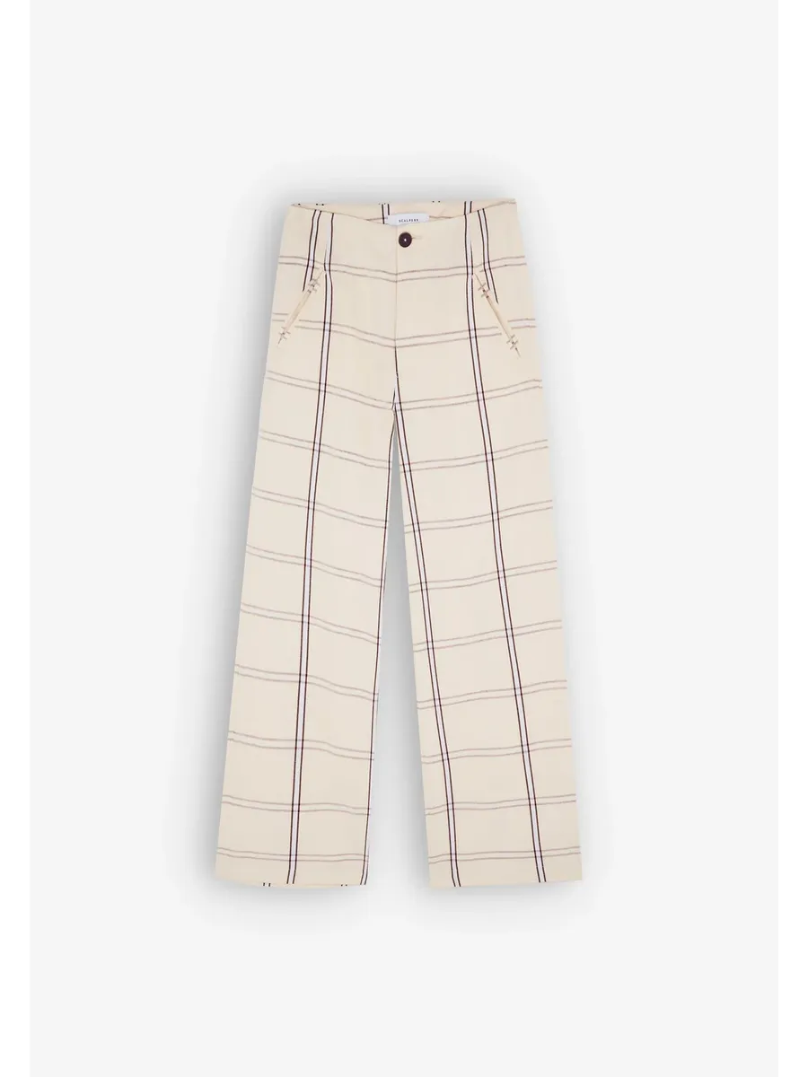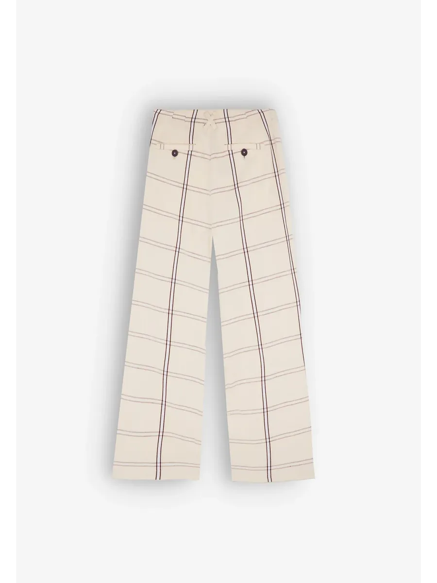 Брюки в клетку с перекрестными петлями сзади на талии. Изготовлены из смеси хлопка и льна Крой типа culotte Высокая посадка Застежка на молнию и пуговицу Двойные яркие боковые карманы Задние карманы vivo и пуговицы