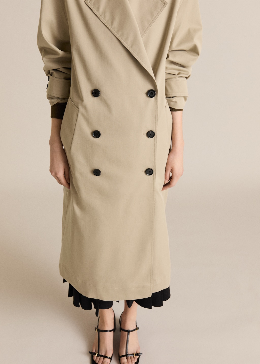 Двубортная застежка обеспечивает удобство и практичность. Тренч легко застегивается и снимается, а также надежно защищает от ветра и дождя.