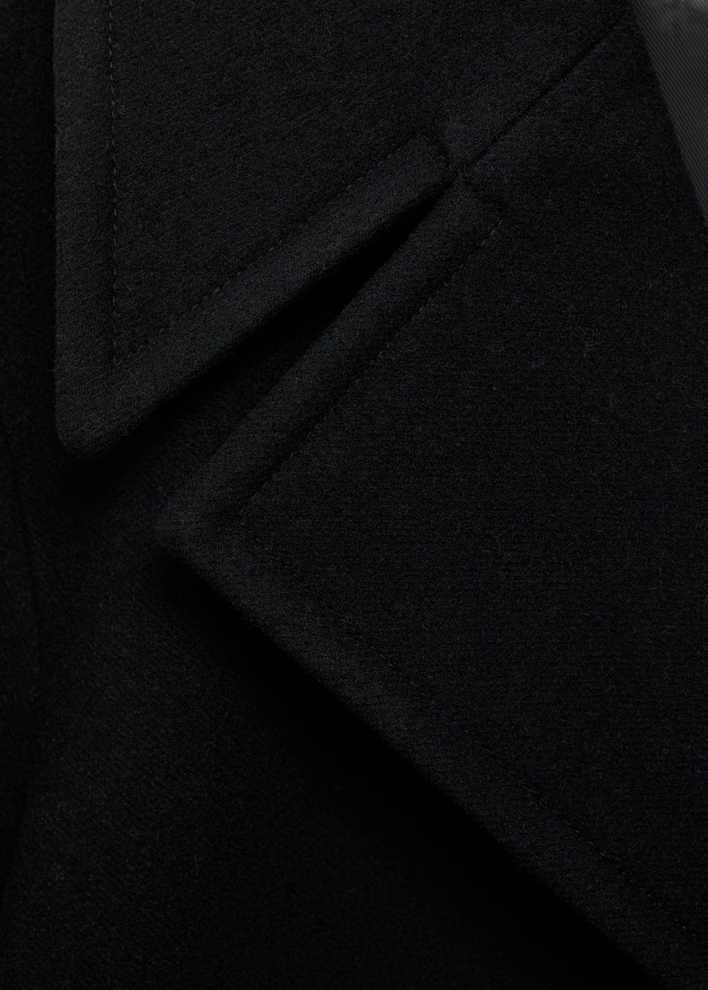 Модель имеет прямой дизайн, перекрёстный фасон и воротник с лацканами. Длинные рукава с манжетами-хлястиками на пуговицах и два боковых кармана добавляют функциональности. Двубортная застежка на пуговицы спереди обеспечивает удобство и надежность.