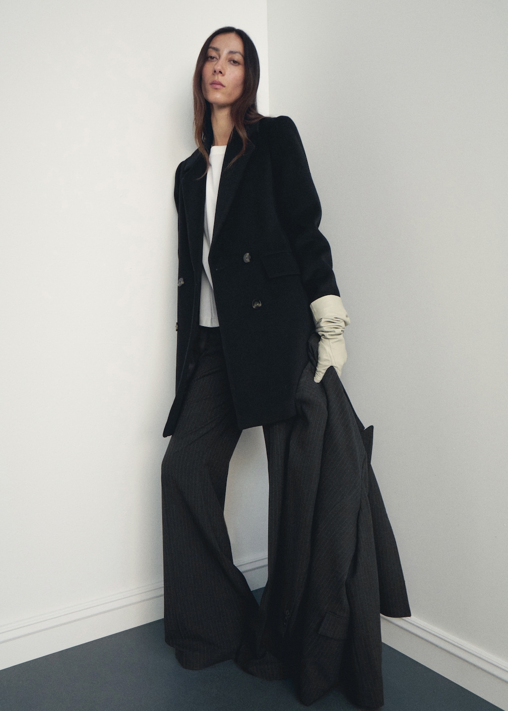 Пальто имеет свободный силуэт, длинные рукава и двубортную застежку на пуговицах. V-образный вырез горловины с лацканами и лацканами с вырезом придают модели элегантности. Длинные карманы с клапанами добавляют практичности.