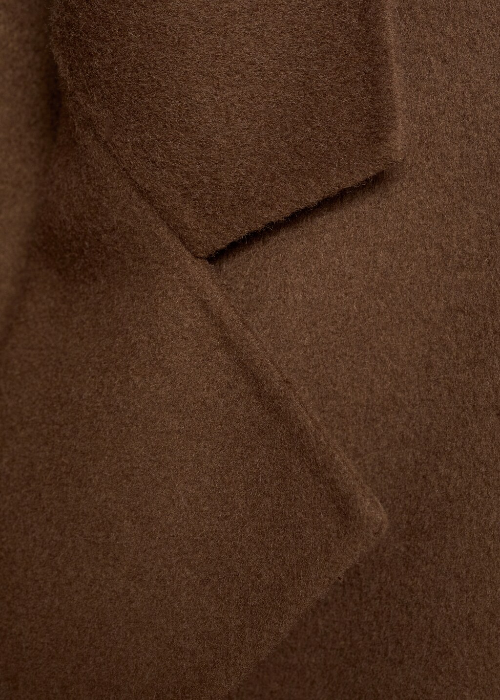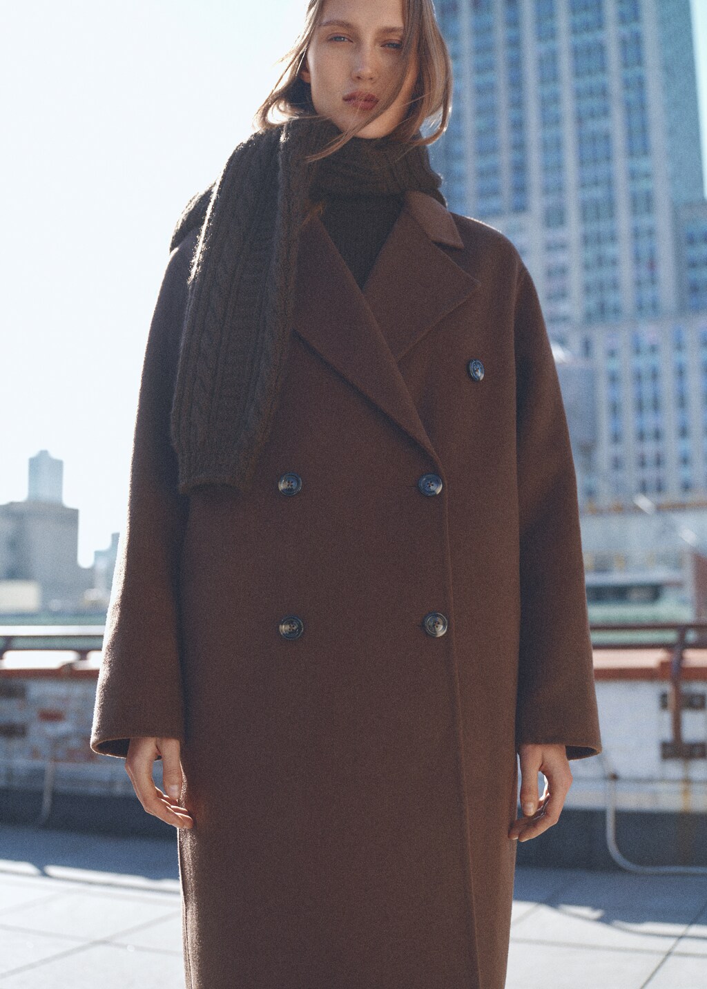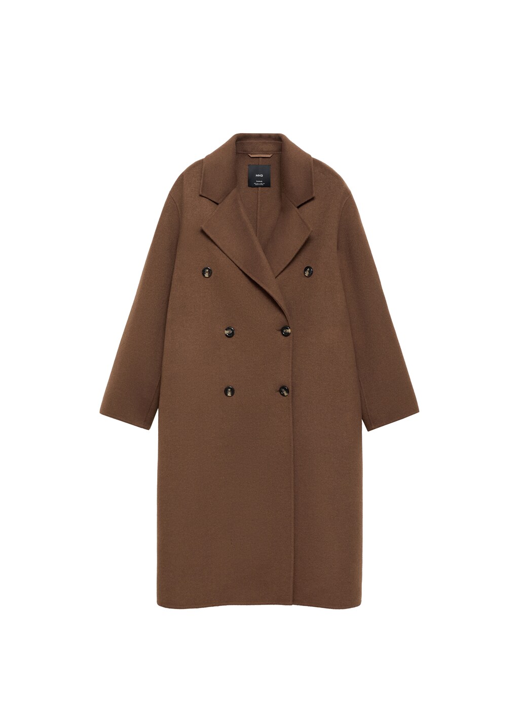 Двубортное пальто с шерстью представлено в коричневом цвете, который легко сочетается с различными аксессуарами и обувью.