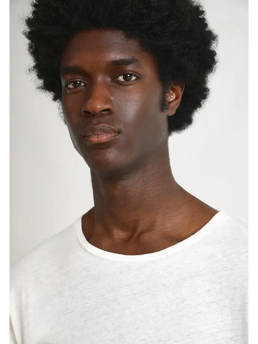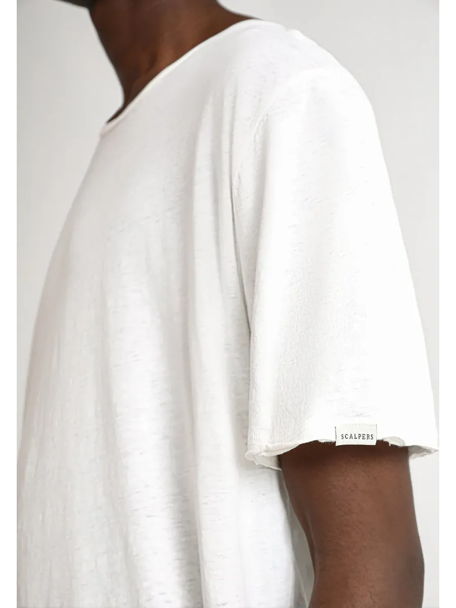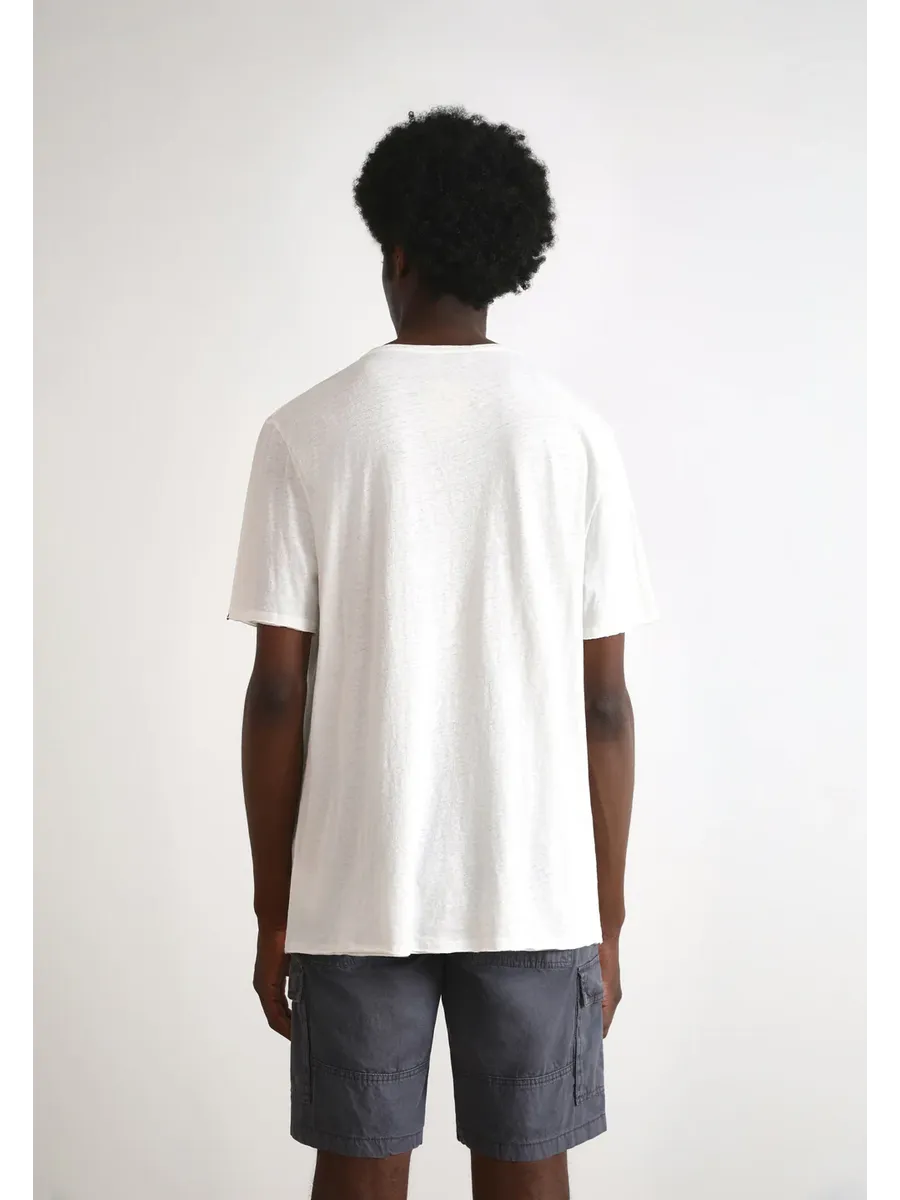Легкая футболка с отделкой на коленях. Изготовлена из смеси хлопка и льна Corte relaxed Круглый вырез с эффектом ролл Короткий рукав с эффектом рулона Подробная информация этикетка на рукаве