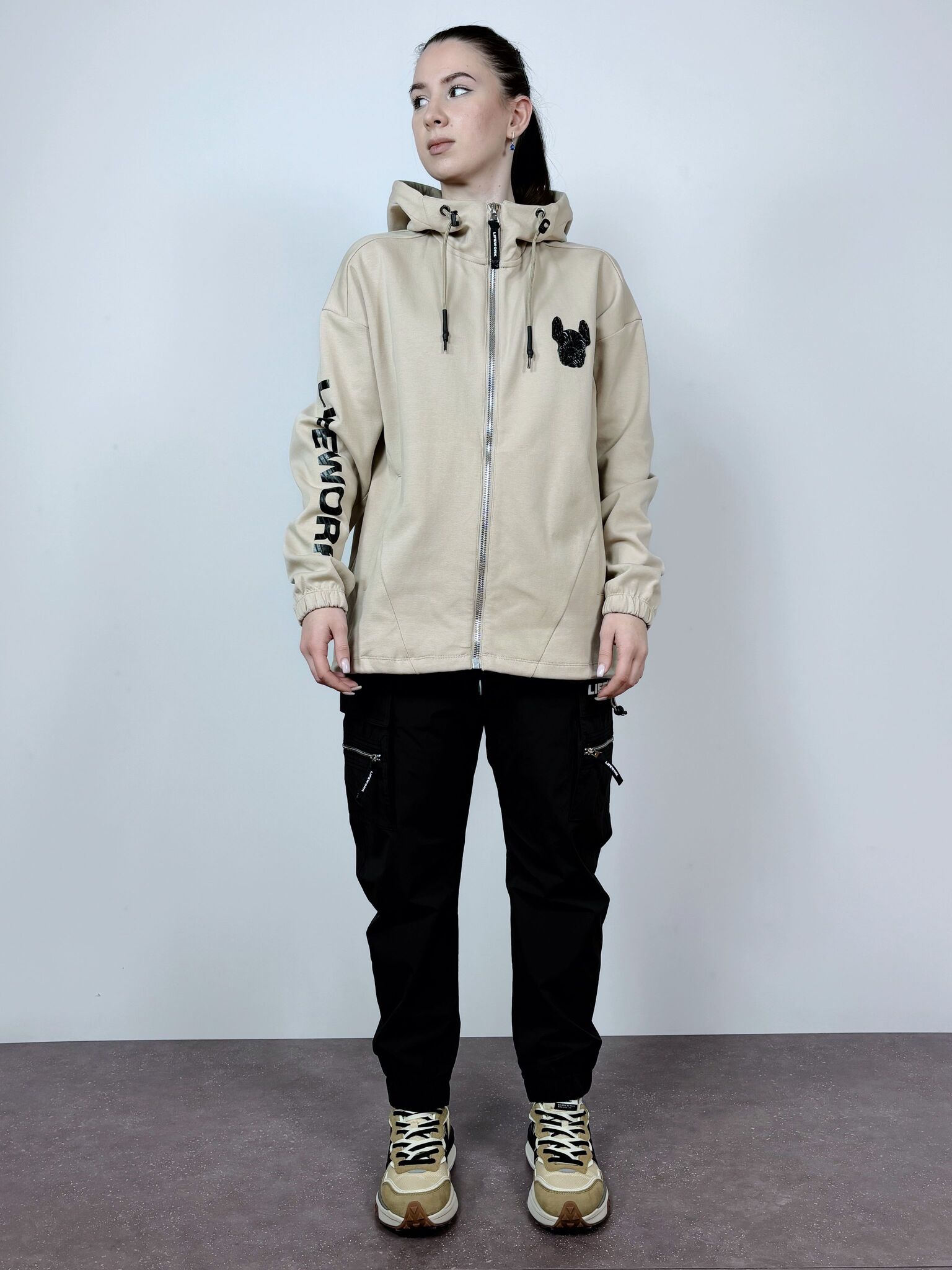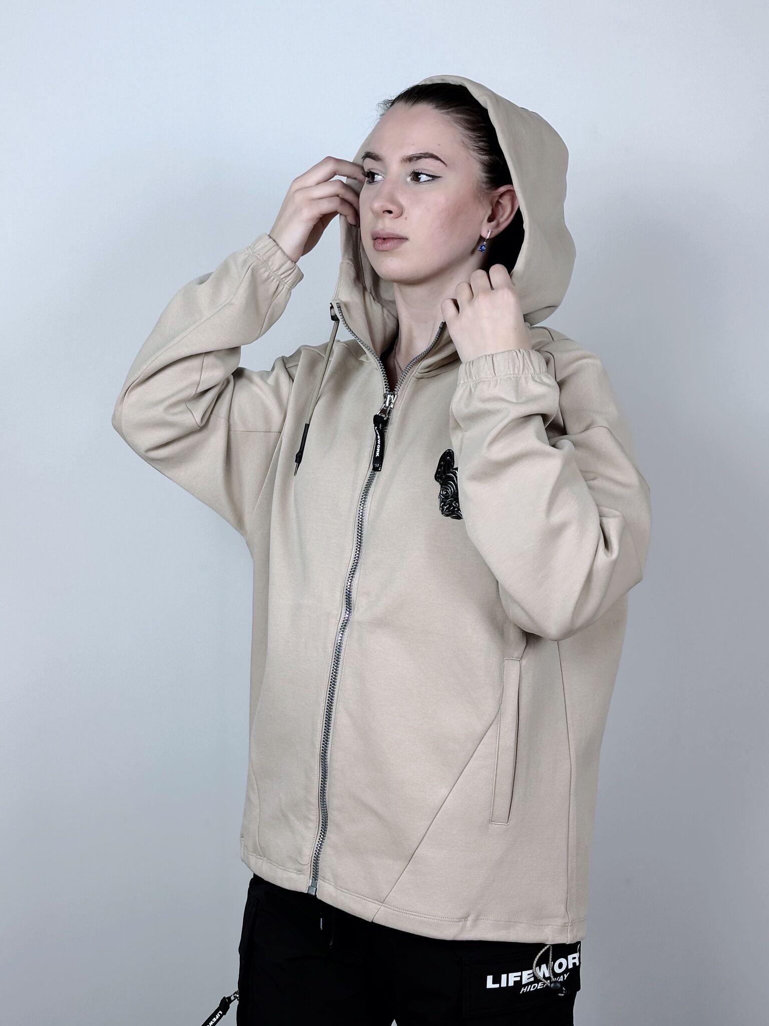 Свитшот на молнии LifeWork выполнен из мягкой смеси хлопка (85%) и полиэстера (15%), что обеспечивает комфорт и тепло. Модель бежевого цвета оснащена капюшоном с регулируемыми шнурками, а также силиконовой нашивкой с логотипом на груди и акцентами в виде логотипов на рукавах и спине. Универсальный стиль делает свитшот отличным выбором для повседневной носки.