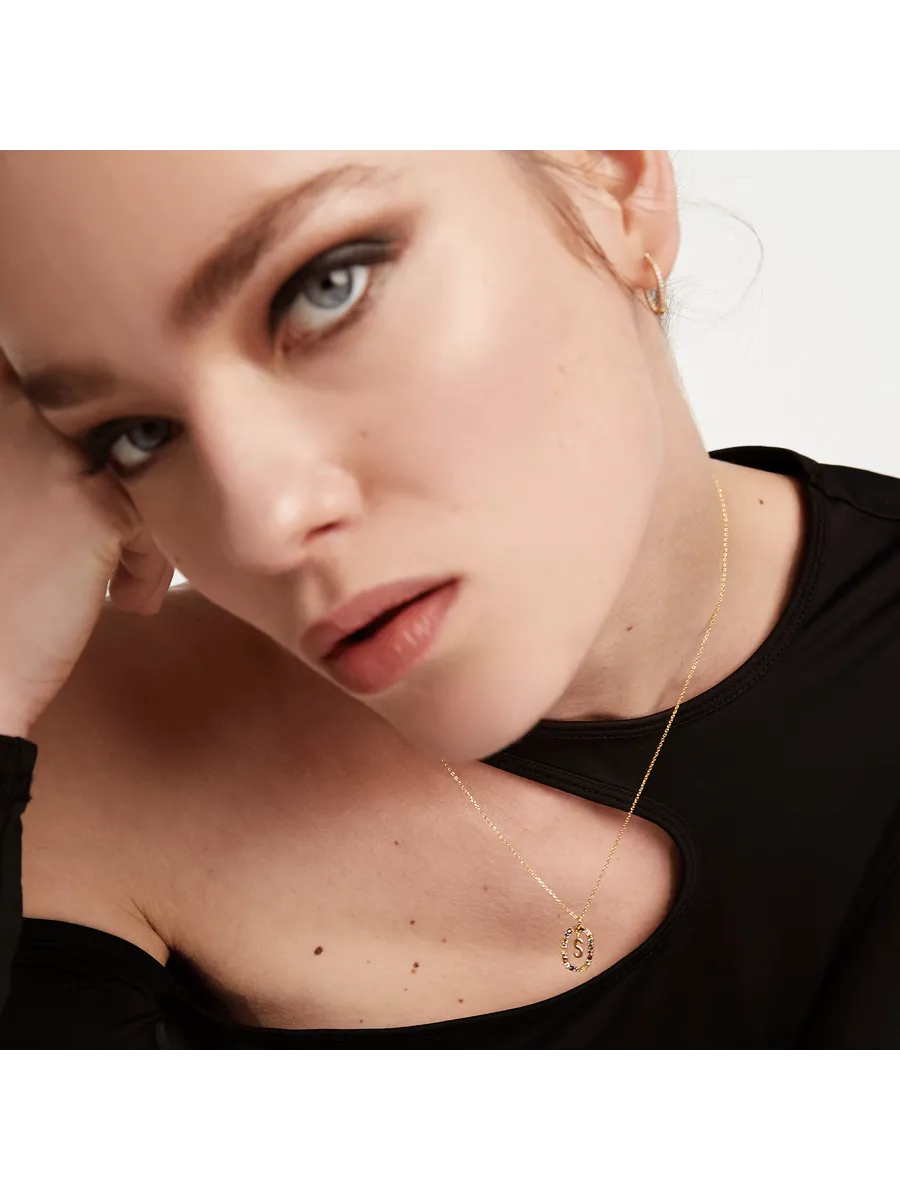 Подвеска с буквами всего латинского алфавита парит в центре овала из камней, создавая неповторимый образ. Цепочка колье регулируется от 40 до 50 см, что позволяет носить украшение на любой желаемой длине.