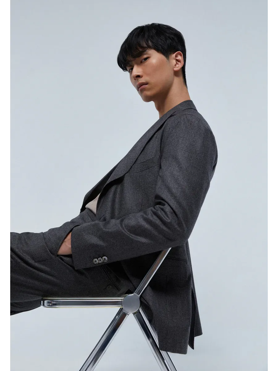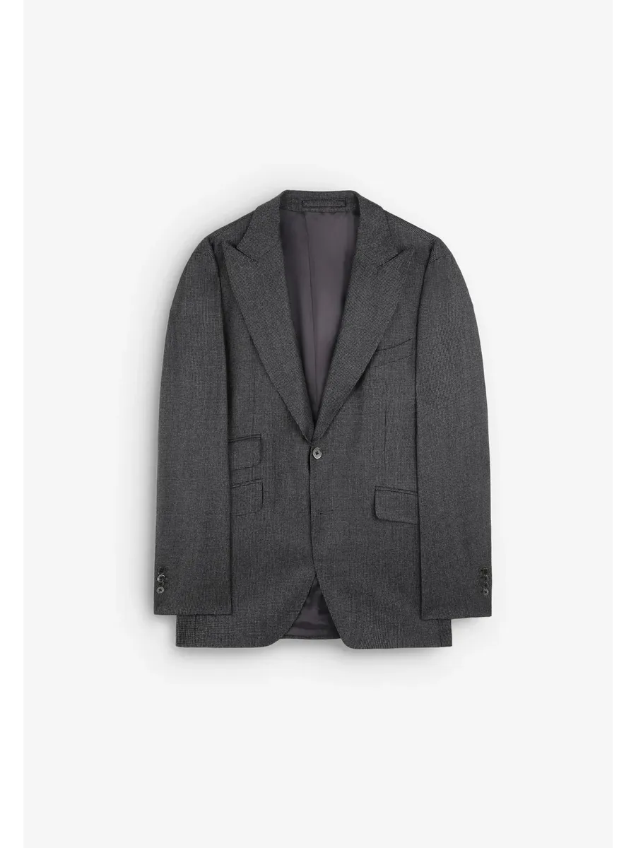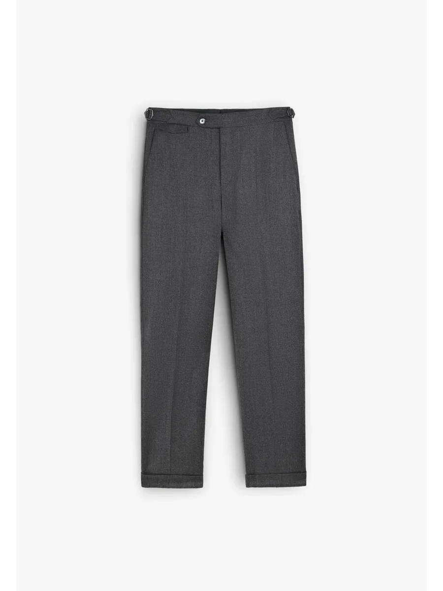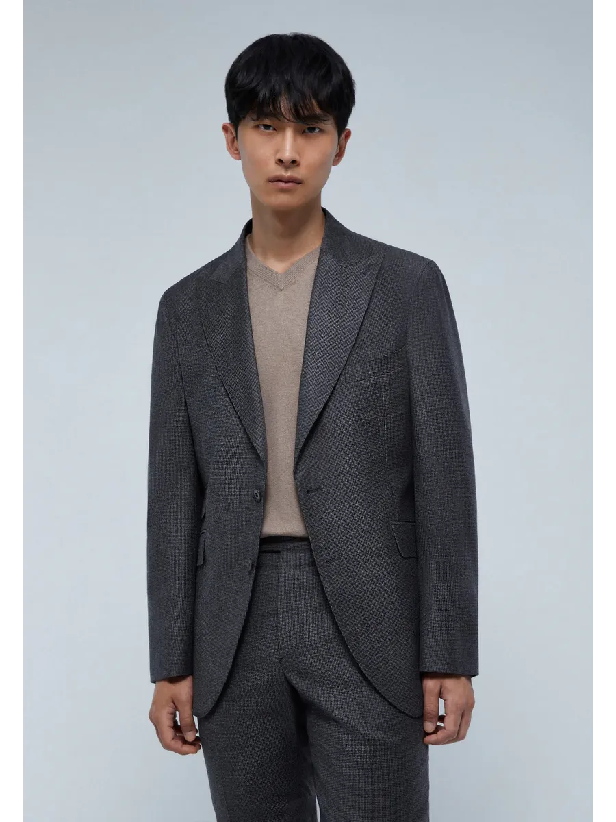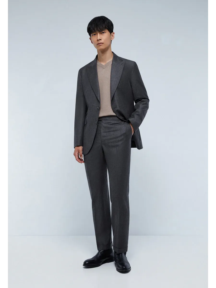 Серый костюм в клетку. Изготовлен из 100% шерстяной ткани от дома Marzotto Обычный крой Безоружный американец с отворотами в виде наконечника копья. Застежка на пуговицы, карманы с клапанами и держателем для спичек. Неаполитанский длинный рукав с практичными петлями Прямые брюки с удлиненными пуговицами на талии и пуговицах. Боковые планки и пуговицы для подтяжек. Низ с отворотом