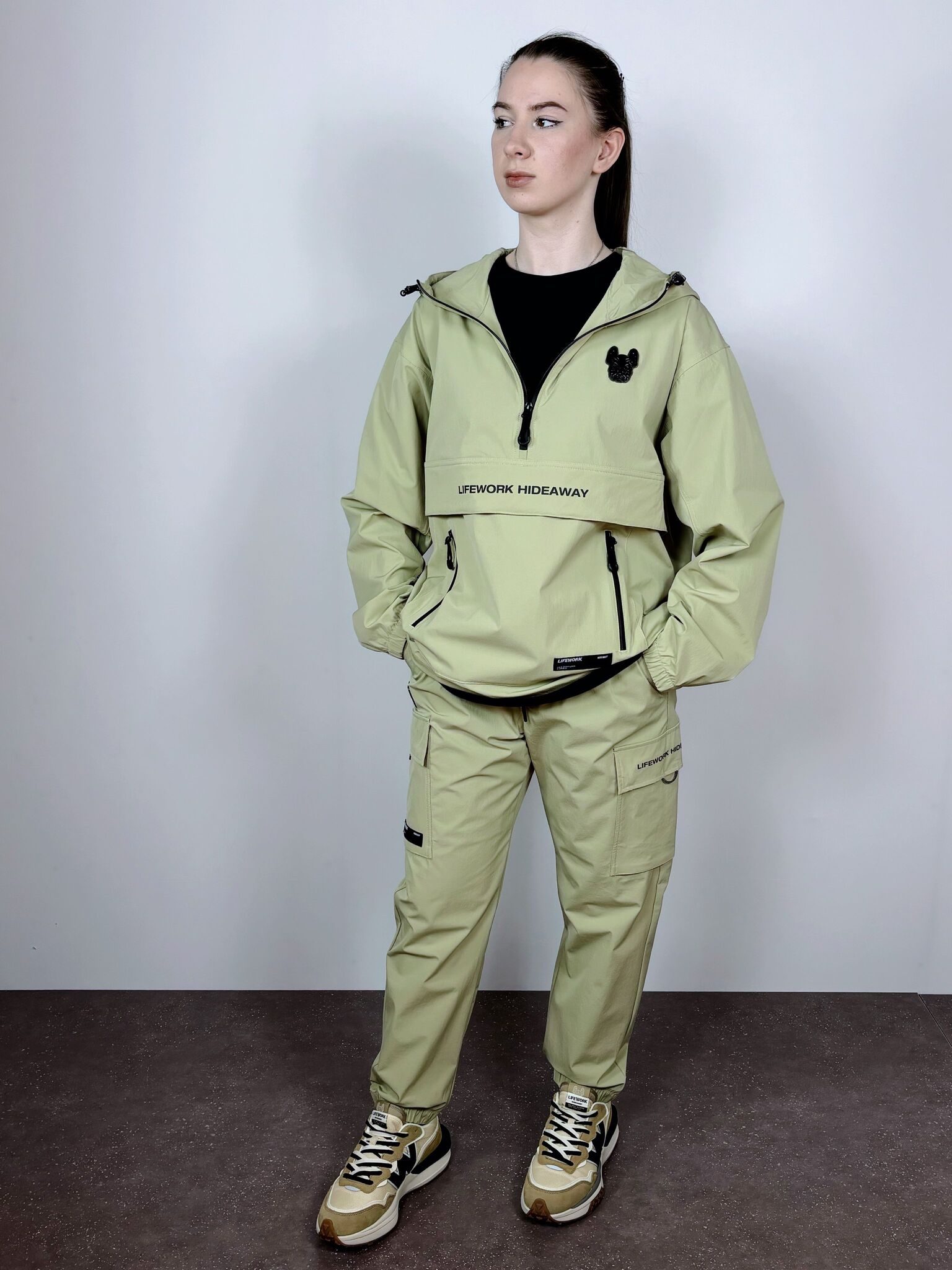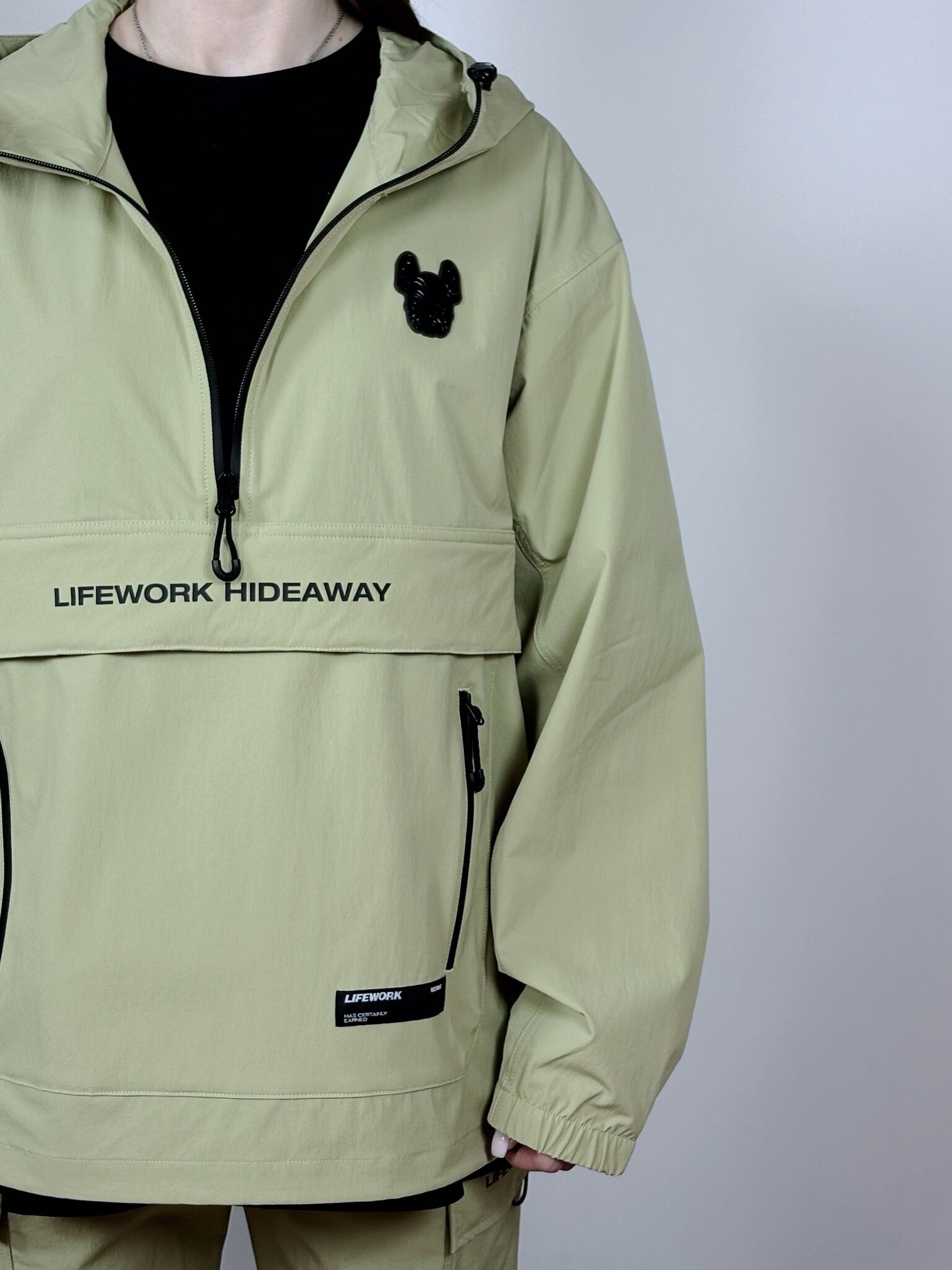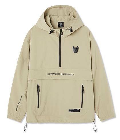 Детали в фирменном стиле: логотип на рукавах, лейбл и нашивка Hapdok подчёркивают эстетику бренда LifeWork — корейского бренда, сочетающего уличную моду и комфорт в повседневной одежде.