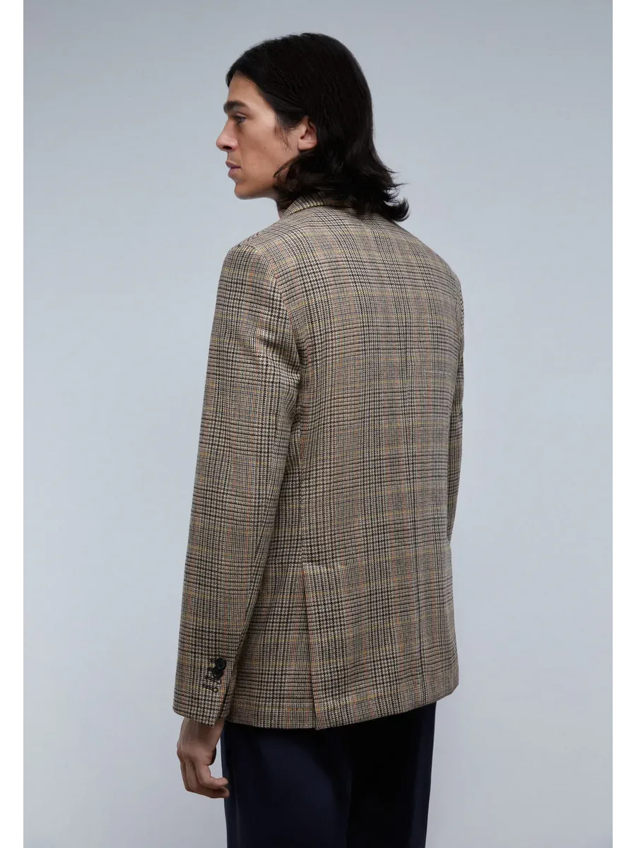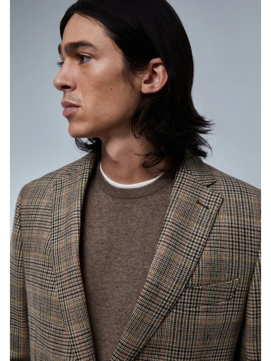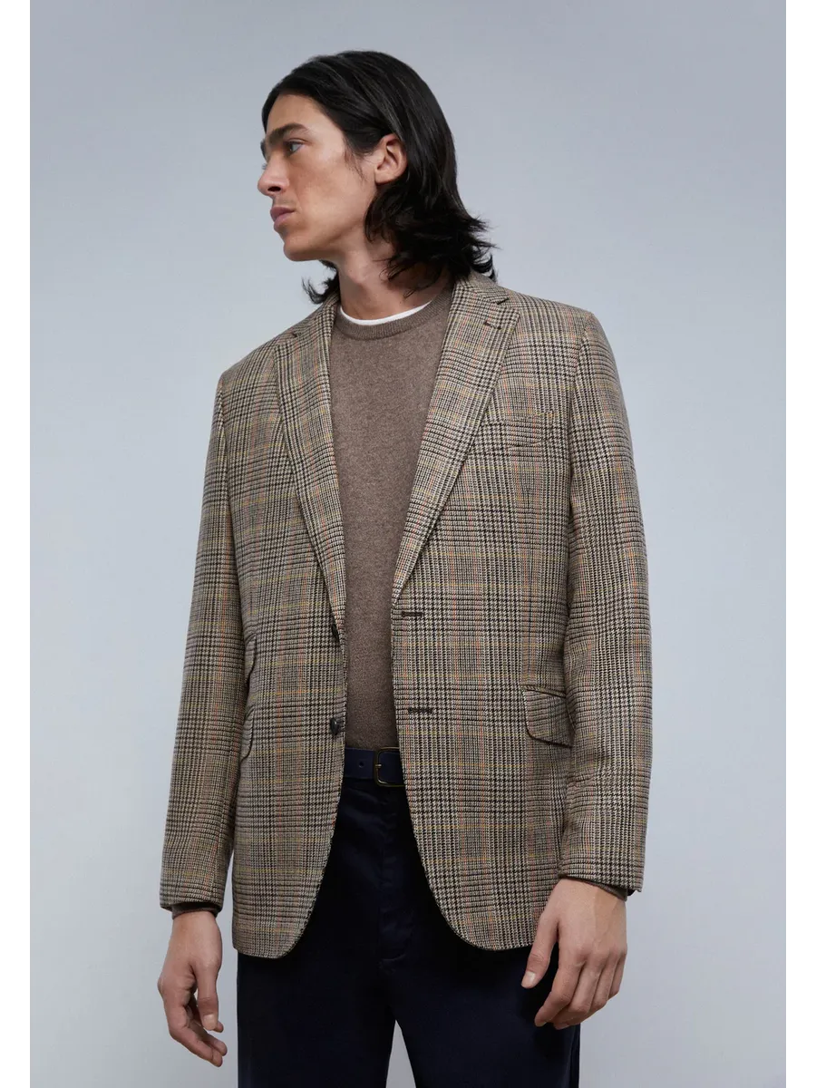 Блайзер мужской в клетку. Изготовлен из смесовой шерсти Обычная посадка Воротник с отворотом с выемкой Застежка на пуговицы Карманы с клапанами Длинный рукав с манжетами и практичными пуговицами