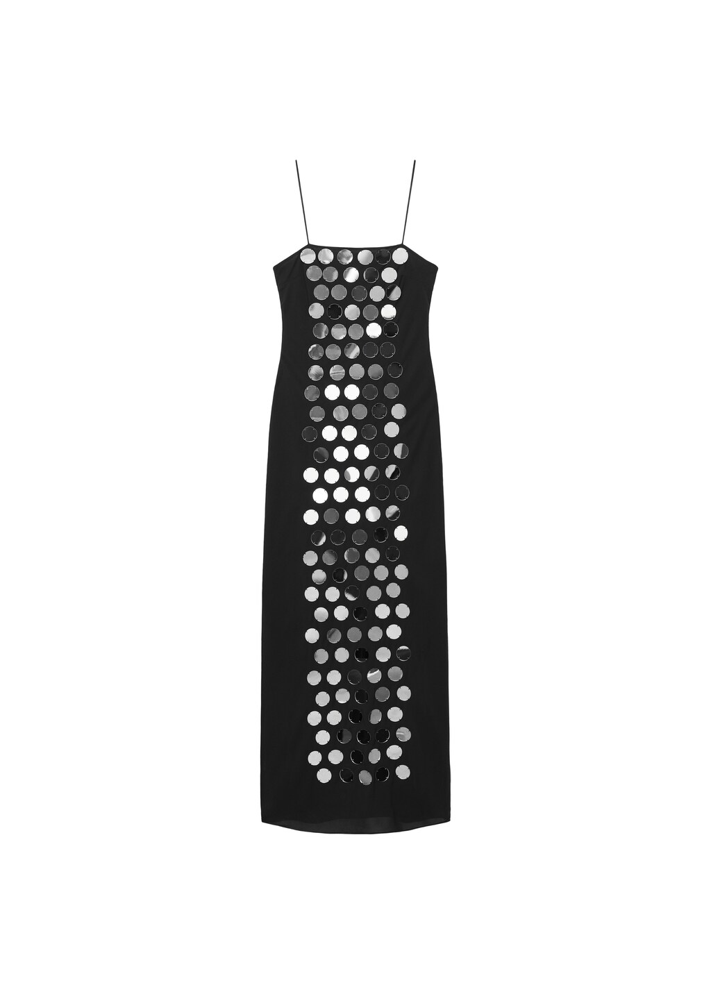 Платье с металлизированными дисками от MANGO - это сочетание стиля и функциональности.