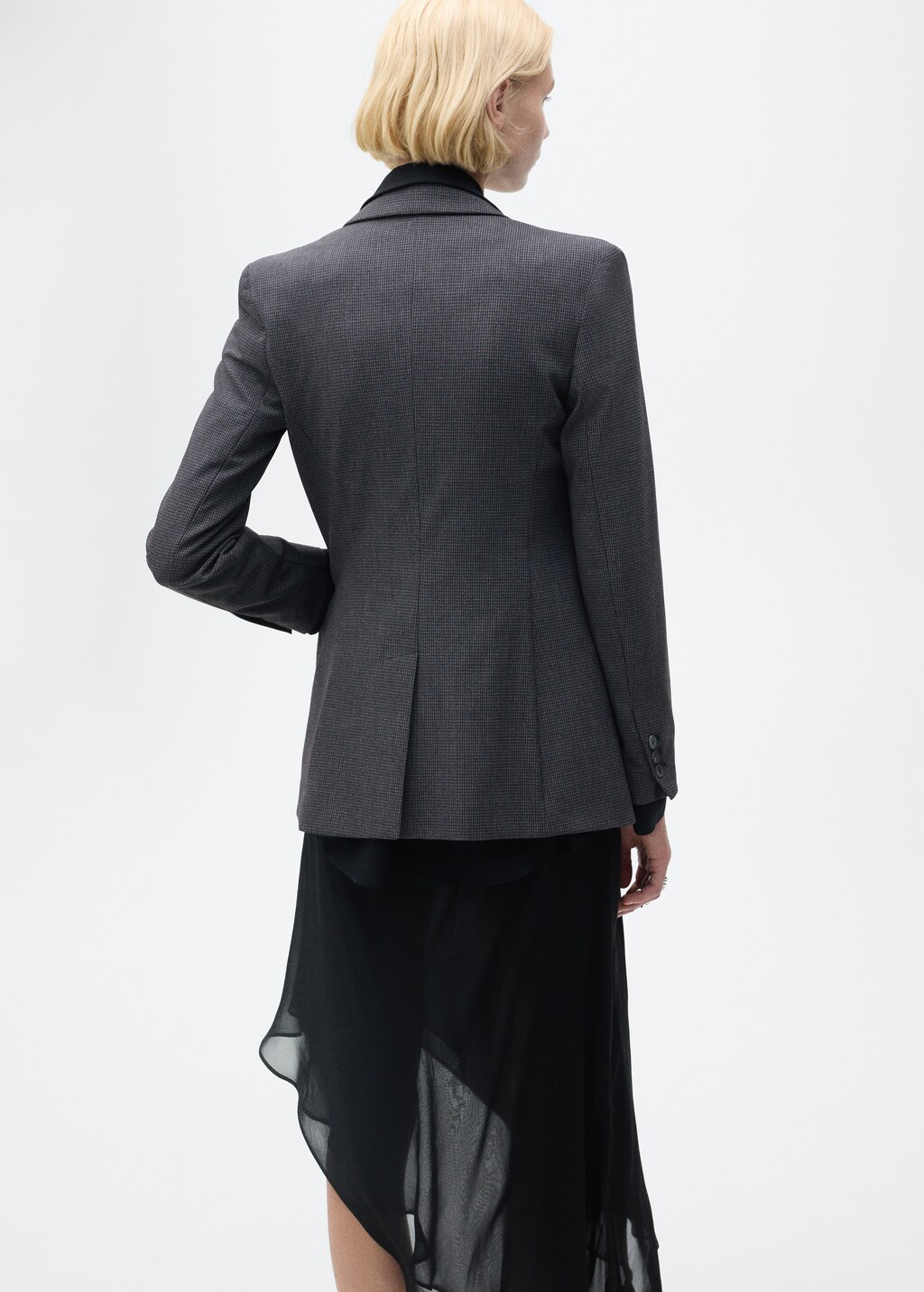 прямой крой, принт в мельчайшую куриную лапку, v-образный вырез горловины с лацканами, длинные рукава с пуговицами, спереди два прорезных кармана с клапаном, застежка на пуговицы спереди, задний разрез внизу, подкладка,, . внешняя длина: 49,3 cm . длина спины: 70,4 cm