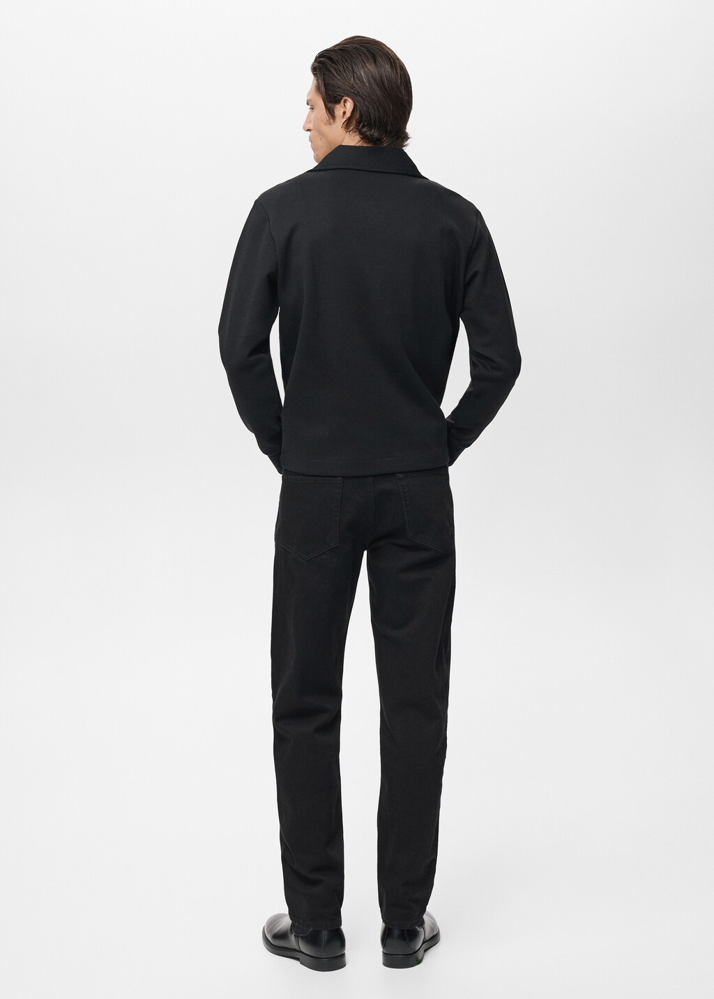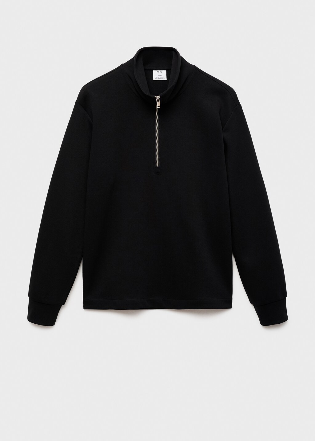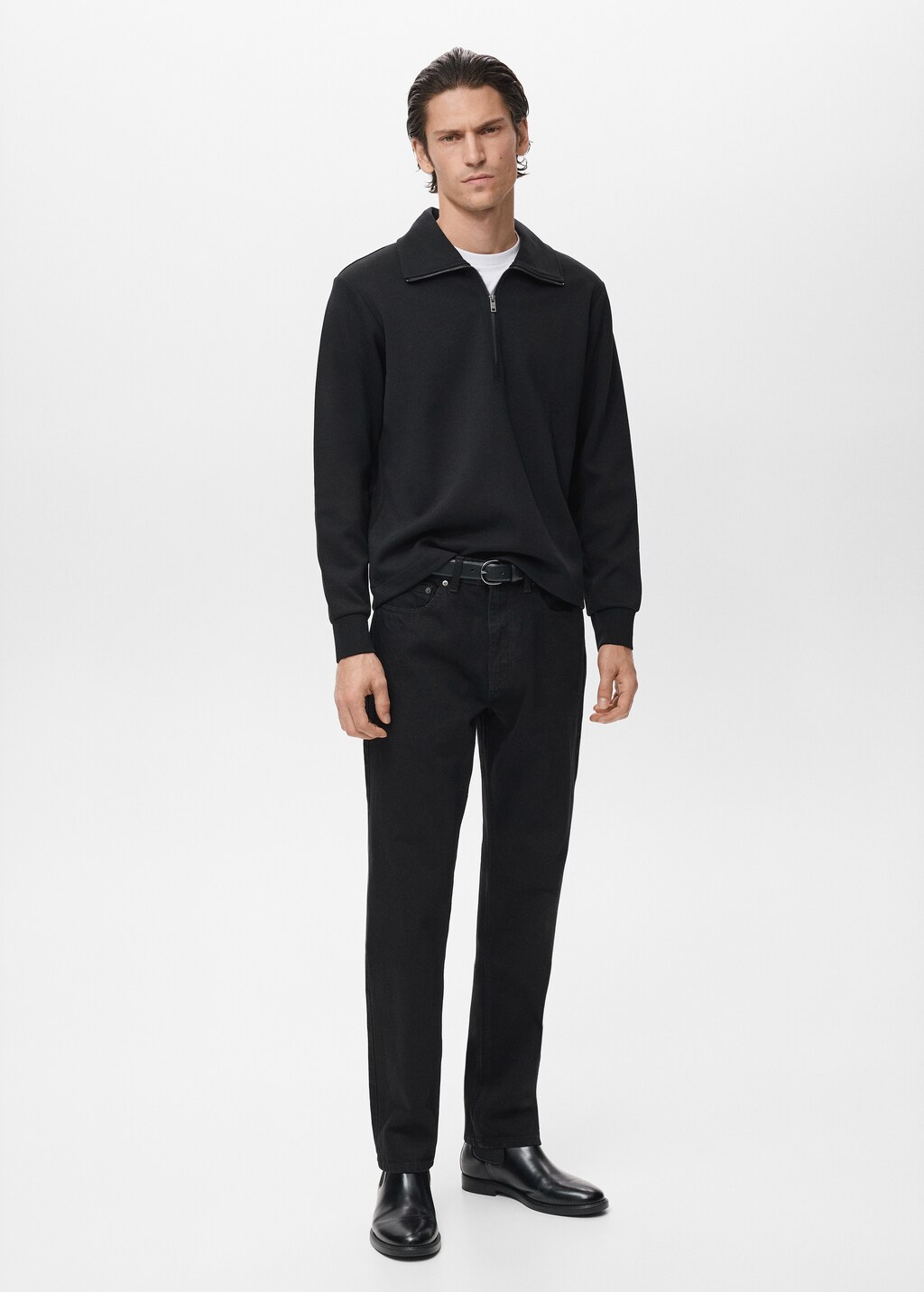 ткань из смеси хлопка, прямой крой, высокий воротник с молнией, длинные рукава с эластичными манжетами, эластичный прямой низ, модель ростом 190 см носит размер m
