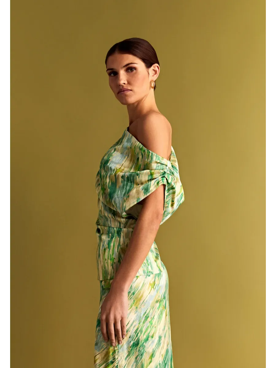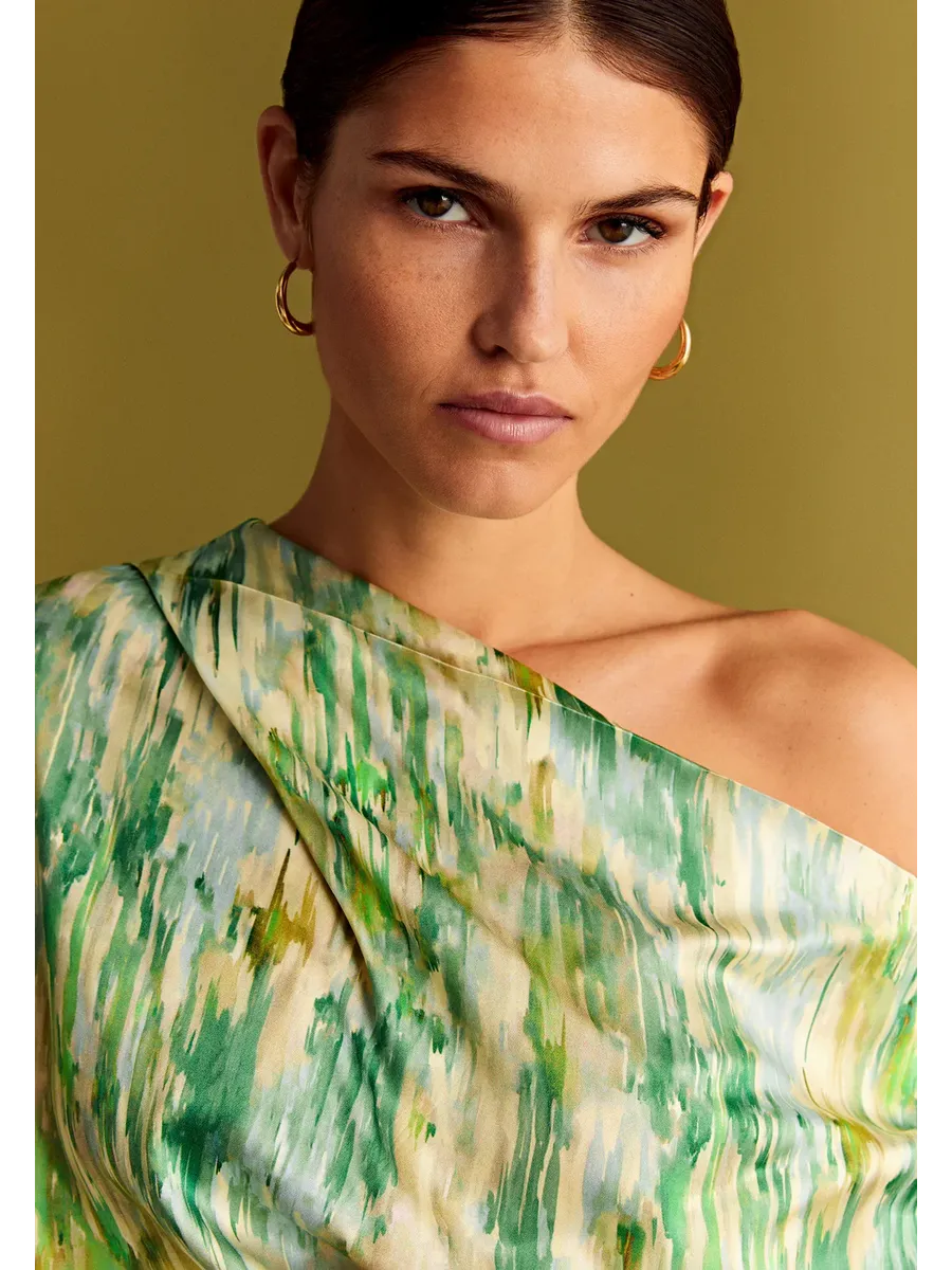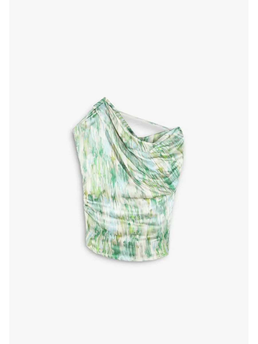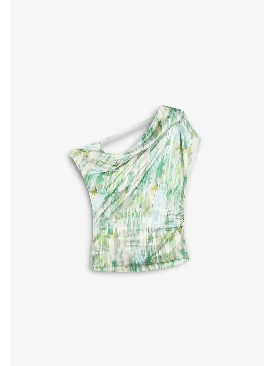 Топ с принтом и деталями в виде рюшей. Изготовлен из слегка эластичной вискозы Slim fit Асимметричный вырез горловины Пройма рукава