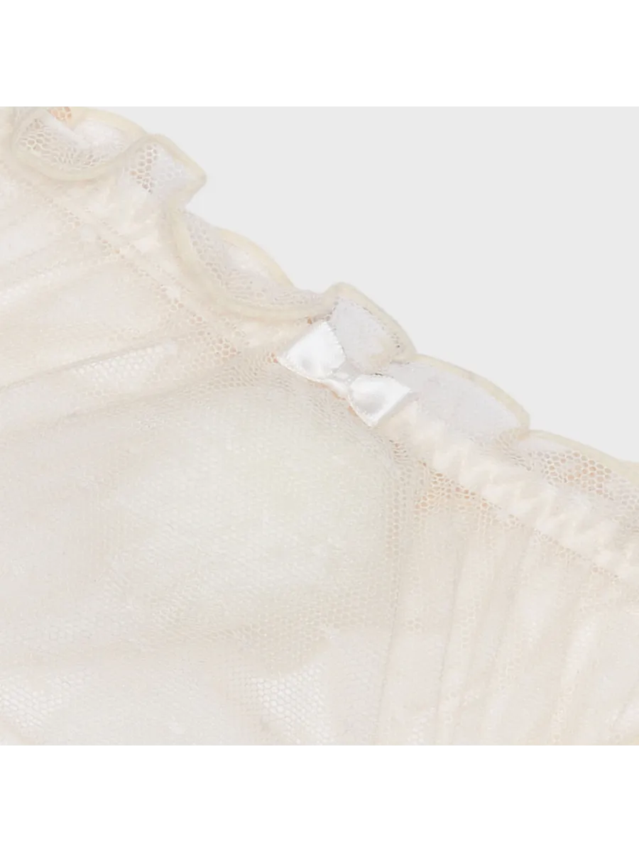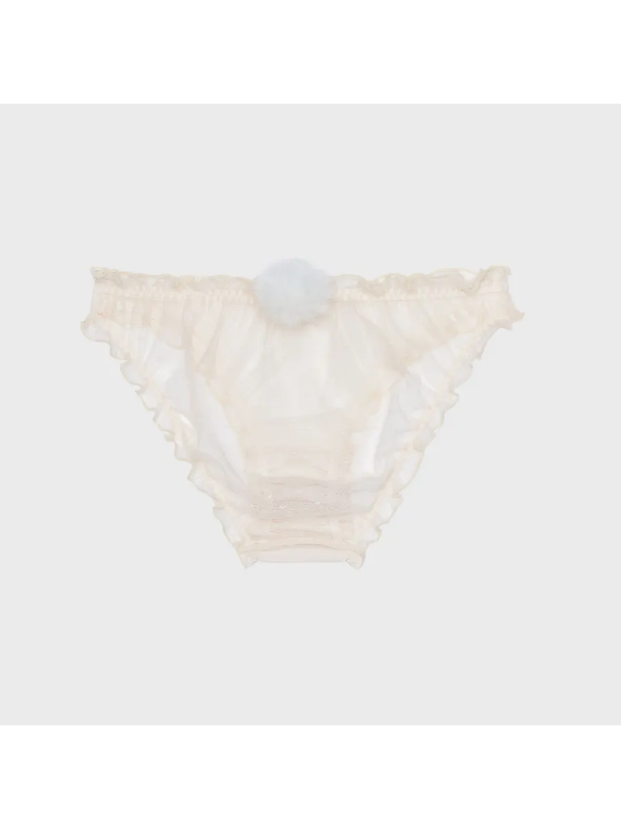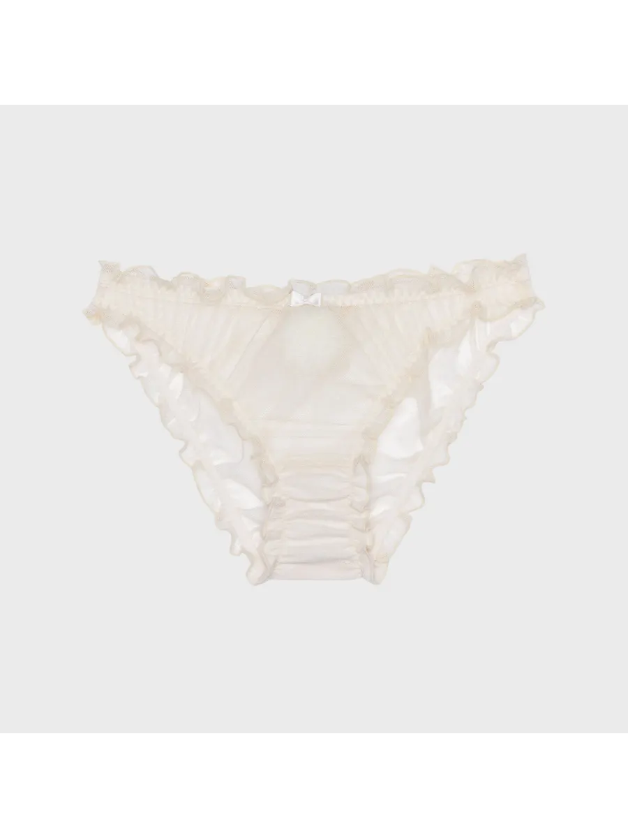 Трусы имеют стандартный тип талии и декорированы рюшами и сеточкой, что придает им изысканный вид.