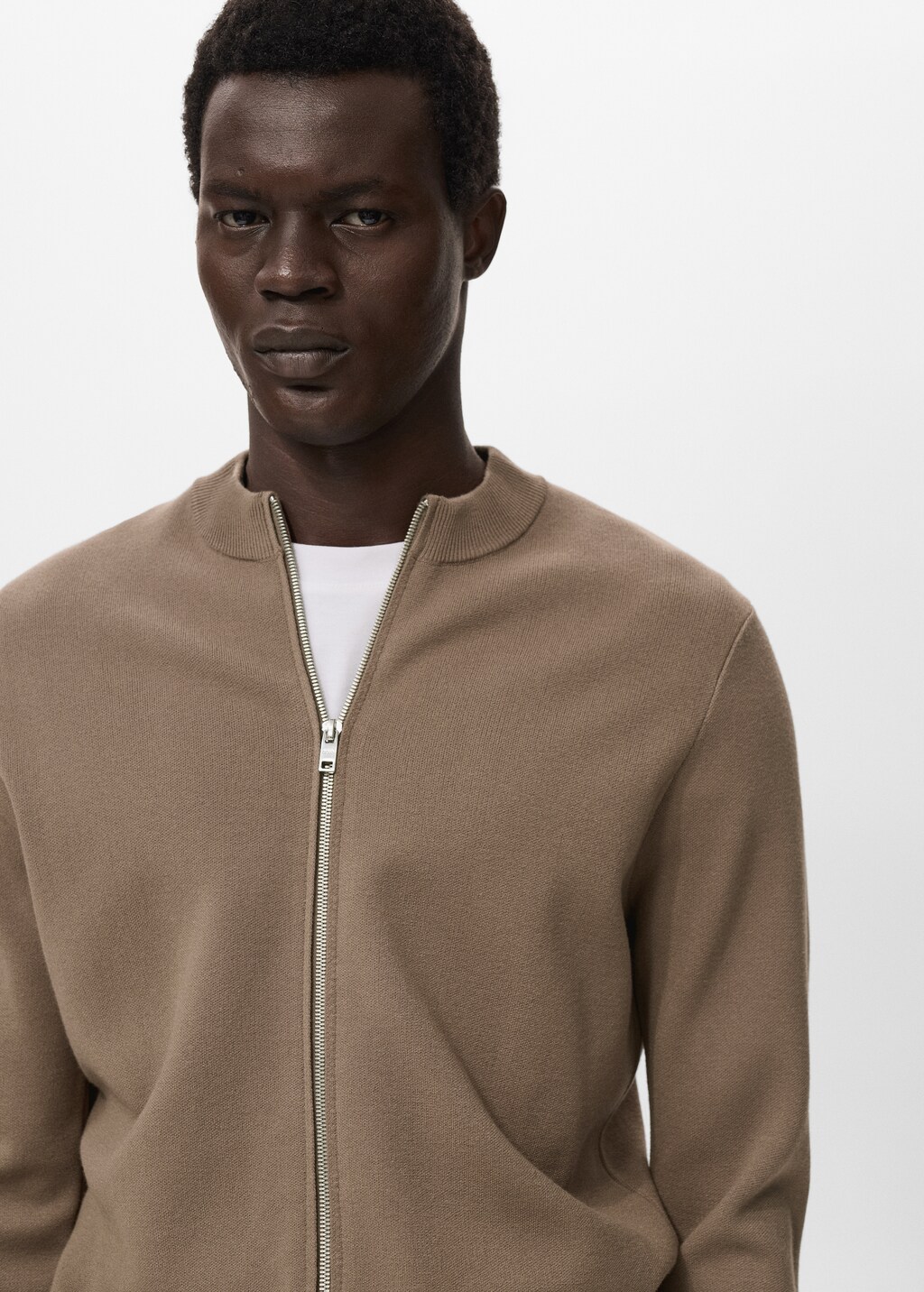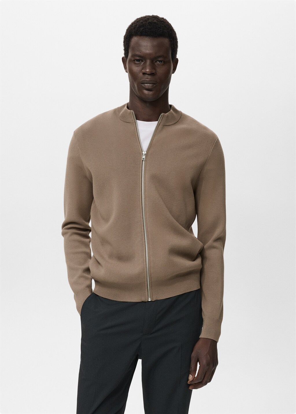 прямой крой, трикотаж средней плотности, воротник, связанный резинкой, спереди застежка на молнию, длинные рукава с эластичными манжетами, прямая линия низа в рубчик, модель ростом 185 см и носит размер m,, . длина спины: 64,5 cm