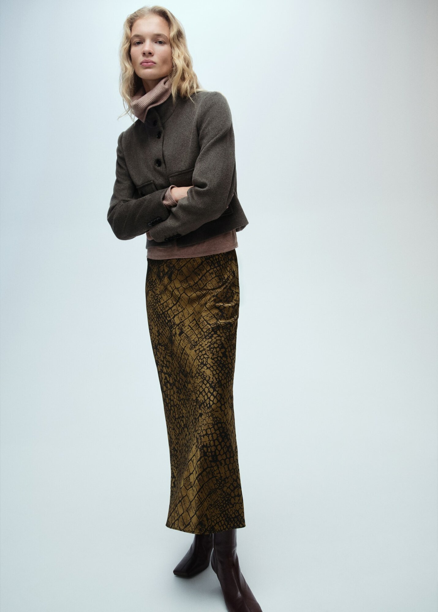 Юбка-колокол с принтом кожи крокодила от MANGO - это стильный и модный выбор для взрослых.